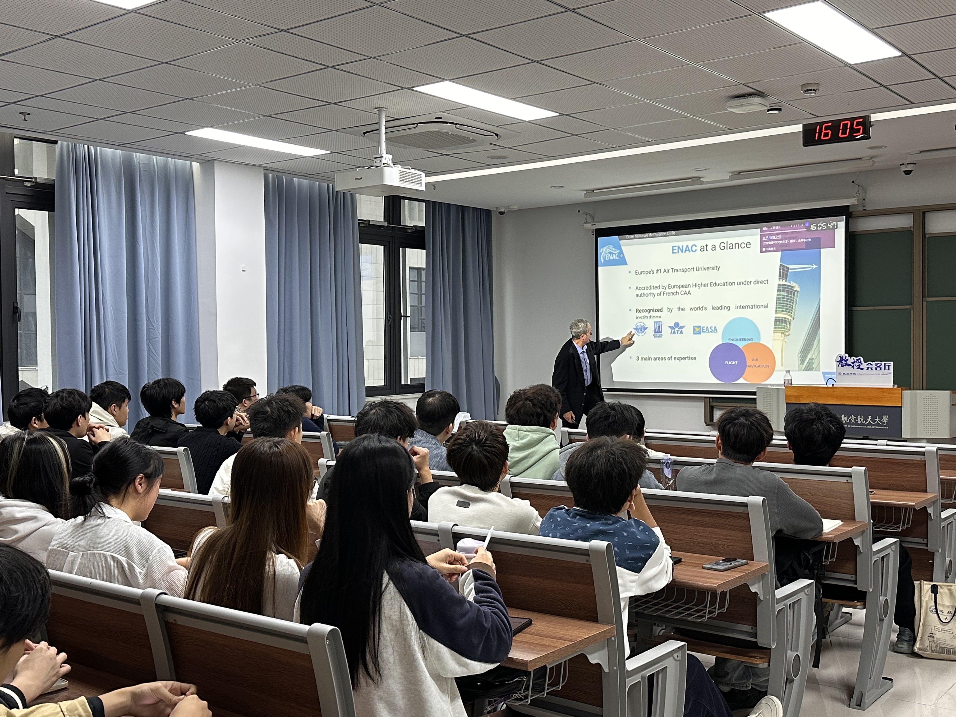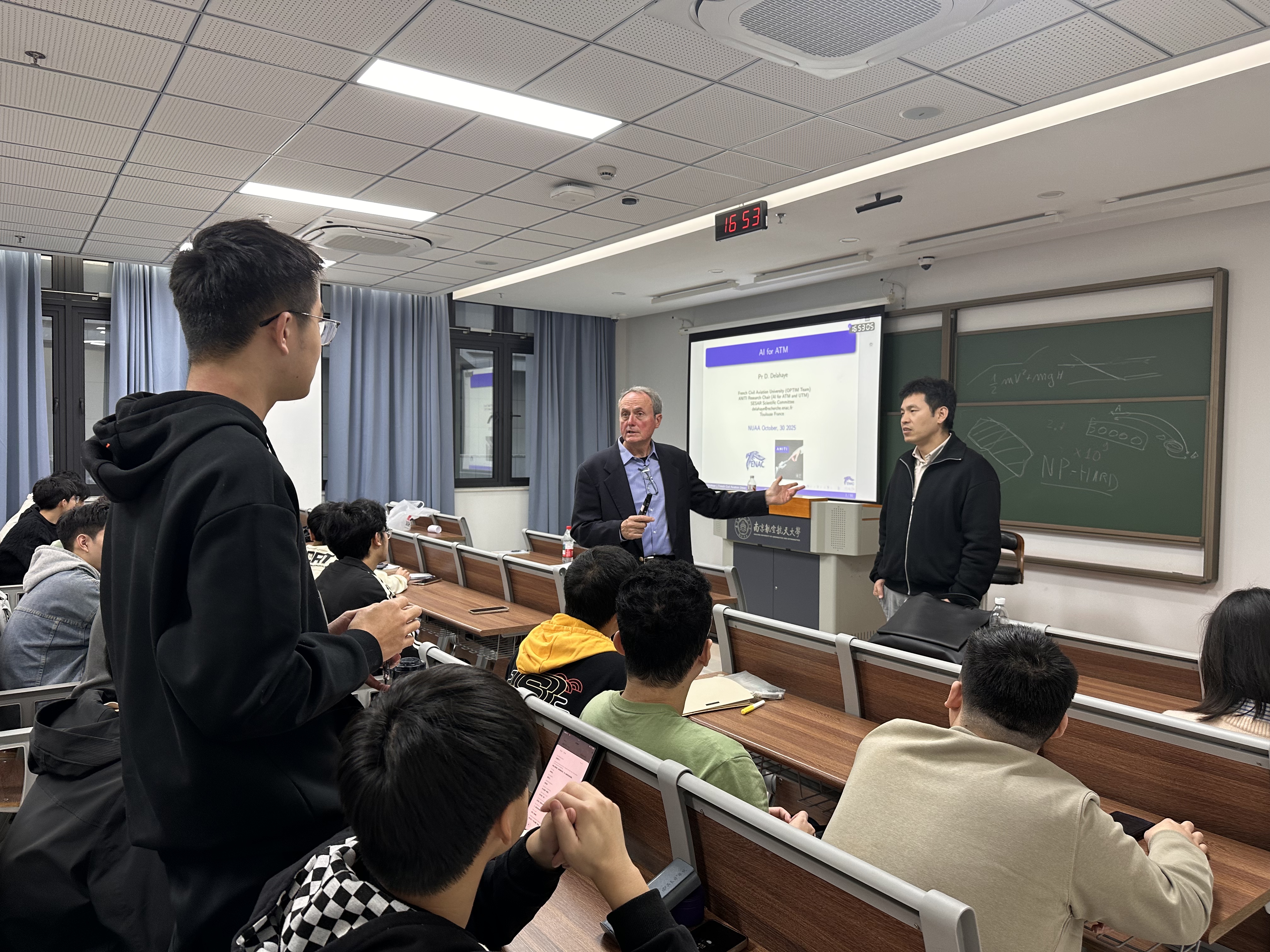 为帮助学生深入了解人工智能技术在空中交通管理(Air Traffic Management,ATM)领域的前沿应用与未来发展,10月30日,后入av 在天目湖校区T2311教室举办《AI FOR ATM》专题讲座。讲座特邀外籍教授Daniel Delahaye进行全英文讲授,空管系教师王艳军、辅导员王雨薇和2024级空管专业全体学生参与。