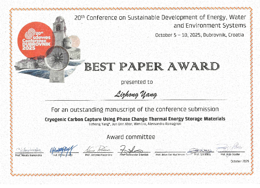 10月5日至10日,第二十届能源、水和环境系统可持续发展大会(Conference on Sustainable Development of Energy, Water and Environment Systems,SDEWES)在克罗地亚杜布罗夫尼克召开,国家级青年人才、后入av 杨立中副研究员等人发表的题为《基于相变储冷材料的超低温碳捕集技术》(《Cryogenic Carbon Capture Using Phase Change Thermal Energy Storage Materials》)论文荣获最佳论文奖。